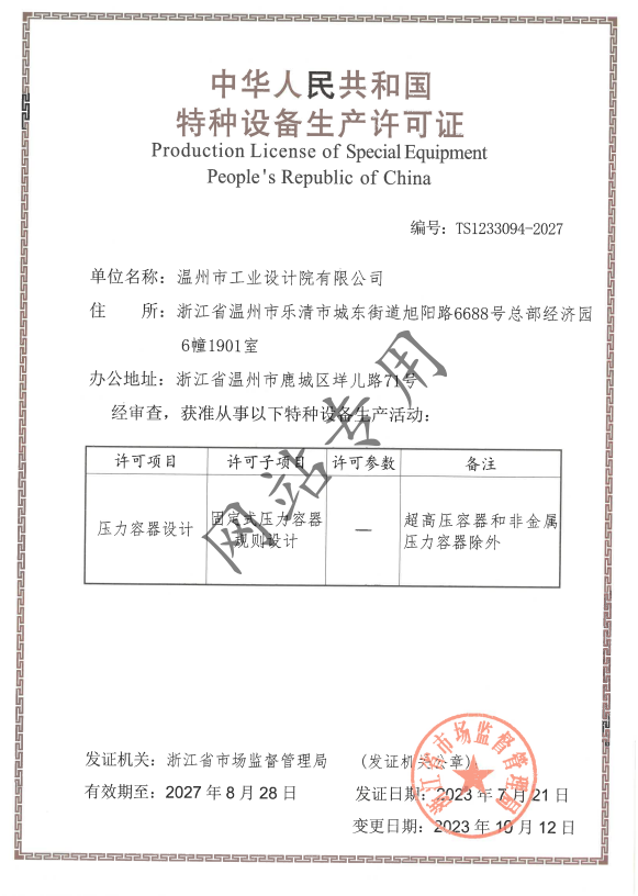 特種設(shè)備設(shè)計(jì)許可證壓力容器