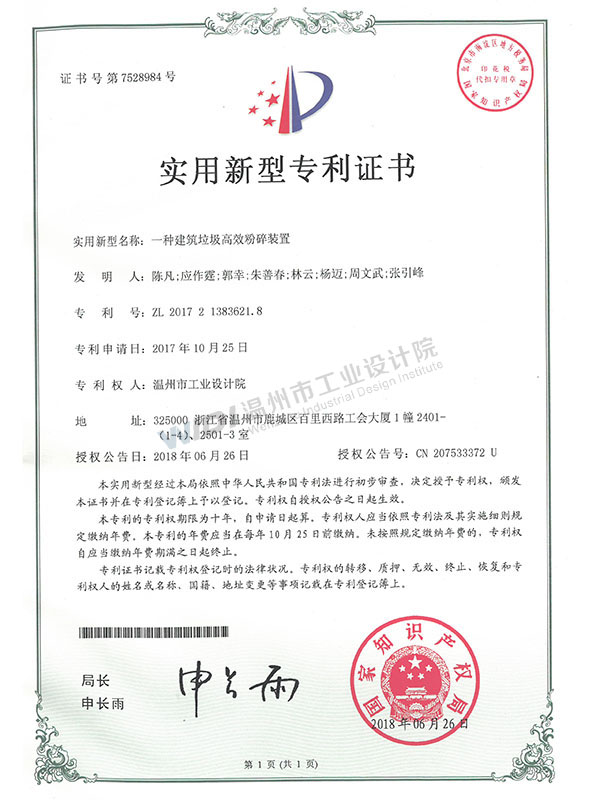 一種建筑垃圾高效粉碎裝置手續(xù)合格通知書 (1)
