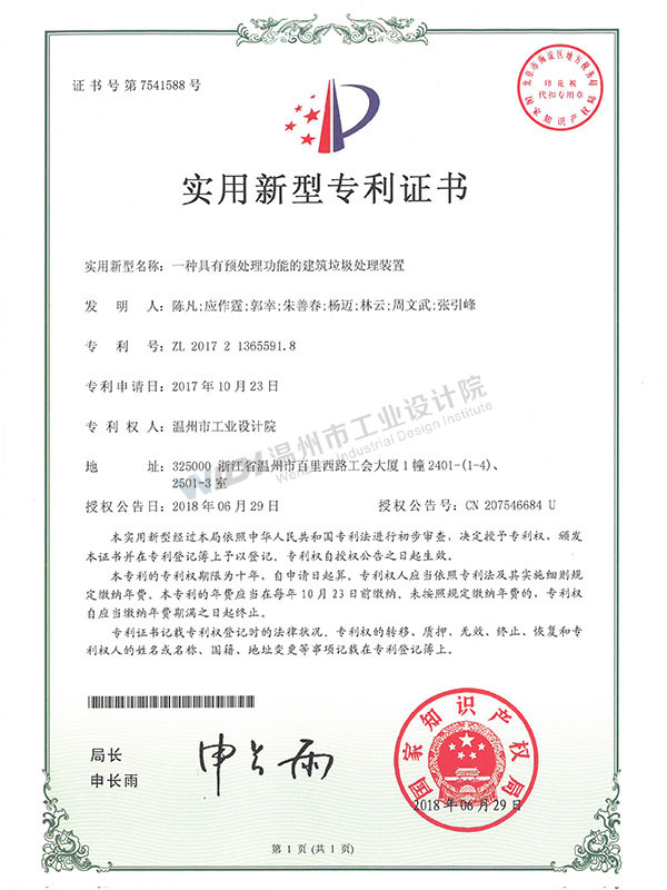 一種具有預處理功能的建筑垃圾處理裝置證書