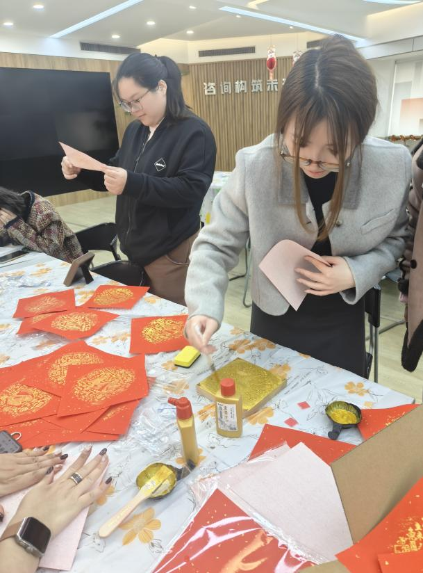活動現(xiàn)場,布置得溫馨且喜慶,燈籠高掛、春聯(lián)映目、年花簇擁,處處洋溢著濃郁的節(jié)日氣息。全體員工熱情響應,踴躍參加。活動伊始,大家有序簽到并領取了手工DIY所需的材料。此次活動準備了多個富有傳統(tǒng)文化韻味的手工項目。福字 DIY 鉆石貼區(qū),員工們專注地將一顆顆閃耀的鉆石鑲嵌在特制模板上,在細致操作中,寓意吉祥的福字逐漸成型;“家和萬事興”“百福圖” 數(shù)字油畫 DIY 區(qū)域,大家依據(jù)數(shù)字標識,用畫筆為畫布填充色彩,每一筆都飽含著對美好生活的期許。木版年畫拓印手工 DIY 處,員工們先將宣紙輕柔覆蓋在刻有精美圖案的木版上,再用蘸滿顏料的刷子均勻刷過紙面,隨后小心翼翼地揭開宣紙,一幅幅承載著歷史記憶與美好寓意的木版年畫便躍然紙上 。經(jīng)過一個多小時的創(chuàng)作,一幅幅精美的手工作品陸續(xù)誕生。這些作品不僅展示了員工們的才華和技藝,更凝聚了大家的智慧和汗水。